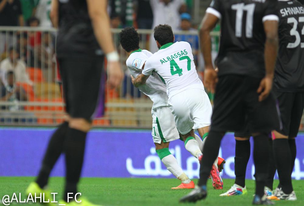 وبدأ الفريق شوط المباراة الأول ضاغطاً على مرمى هجر رغبة في تسجيل هدف مبكر، إلا أن عدة فرص أهدرت أمام المرمى، ومع مواصلة الهجوم على هجر سنحت للأهلي فرصة عند الدقيقة 27 افتتح من خلالها صالح العمري التسجيل بعد كرة عرضية من حسين المقهوي واجه بها العمري شباك المرمى ووضعها معلناً هدف السبق للأهلي، بعدها عاود لاعبو الأهلي الإندفاع نحو مرمى هجر لمضاعفة النتيجة، وهو ما قام به عمر السومة بعد أن قطع تيسير الجاسم الكرة وجهزها للسومة داخل منطقة الجزاء ليسكنها شباك هجر كهدف ثاني للفريق عند الدقيقة 31 لينتهي شوط المباراة الأول بتقدم الأهلي بهدفين دون مقابل.