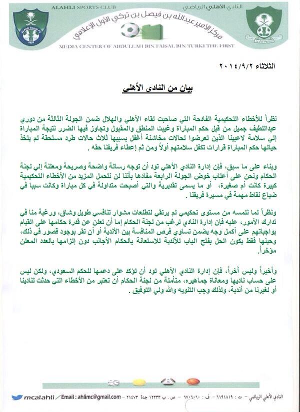 نظراً للأخطاء التحكيمية الفادحة التي صاحبت لقاء الأهلي والهلال ضمن الجولة الثالثة من دوري عبداللطيف جميل من قبل حكم المباراة وغيبت المنطق والمقبول وتجاوز فيها الضرر نتيجة المباراة