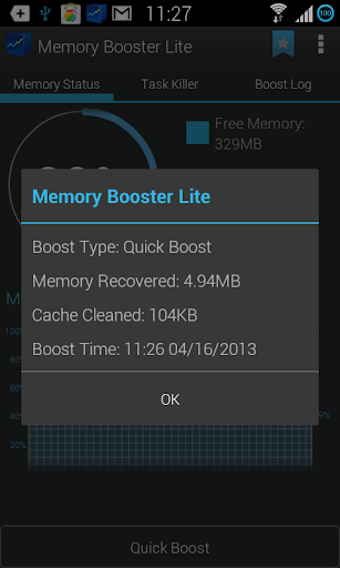 برنامج يعمل على بيئة JVM حيث يقوم بضغط الذاكرة واغلاق التطبيقات الغير مستخدمة مما يوفر مساحة Ram لتشغيل برامج اخرى ولتسريع عمل الجهاز, ستلاحظ الفرق في السرعة بعد استخدام هذا البرنامج , بمجرد ضغط على زر “Boost Memory” سيتم توفير مساحة تصل الى 12 ميقا بايت وأكثر على حسب الجهاز من الذاكرة العشوائة RAM