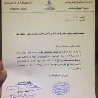 هذه صورة لخطاب رسمي لوكيل اعمال سعيد المولد " احمد المزيني " يؤكد فيه بأن سعيد المولد (( اتحادي )) وبعقد رسمي