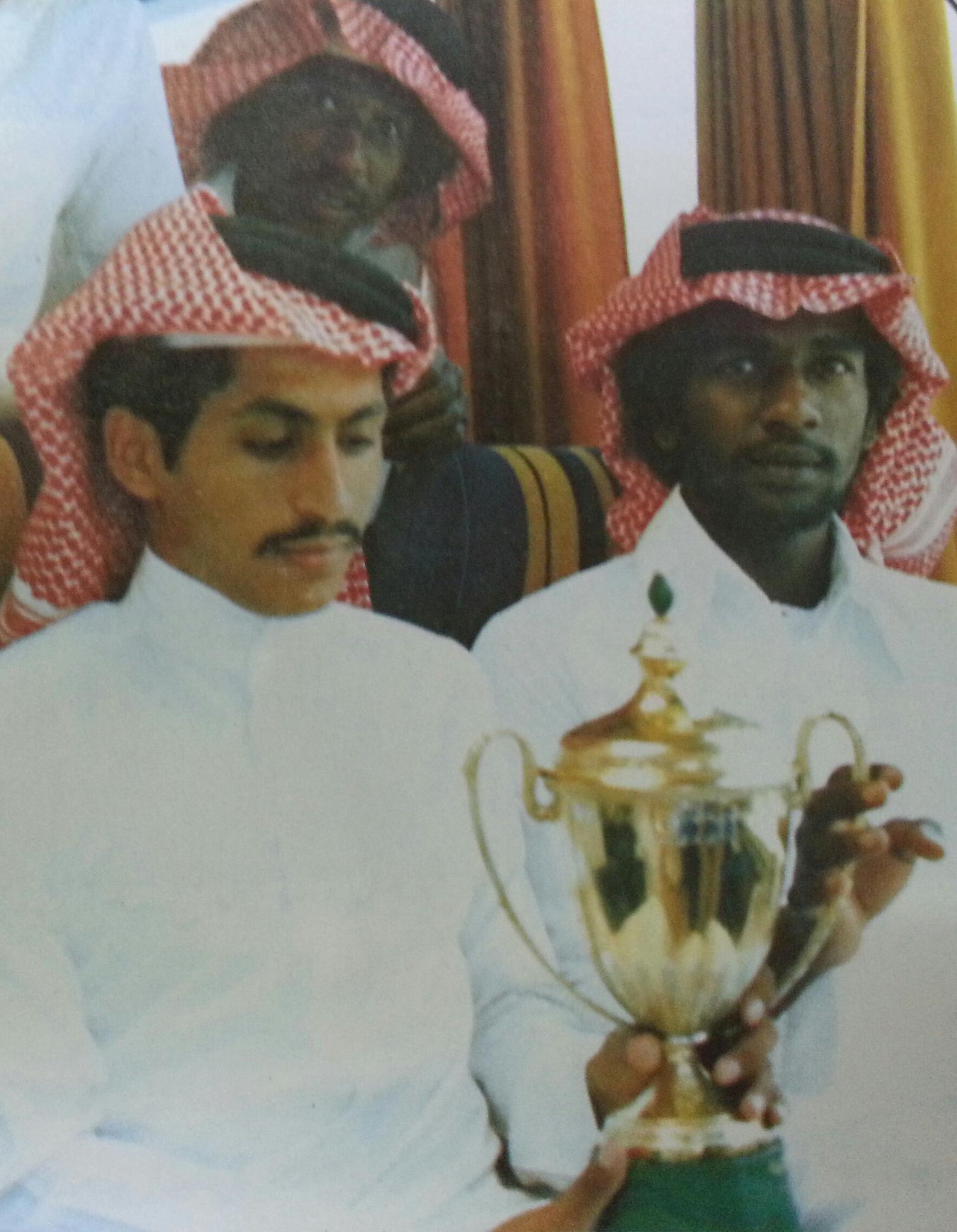 صور نادرة لماجد عبدالله -يحمل كأس بطولة الملك وبجانبة علي كميخ وخلفة محمد