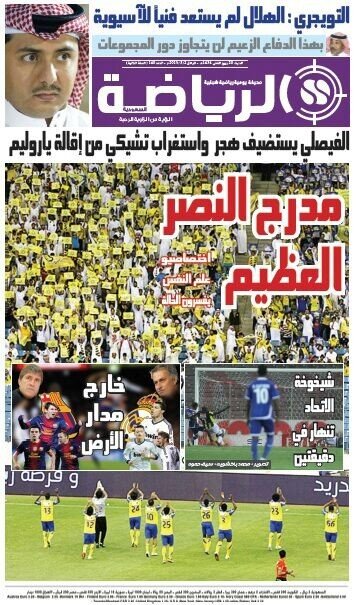 غلاف جريدة الرياضة السعوديه اليوم السبت ( علماء النفس يحللون ظاهرة جمهور الشمس )