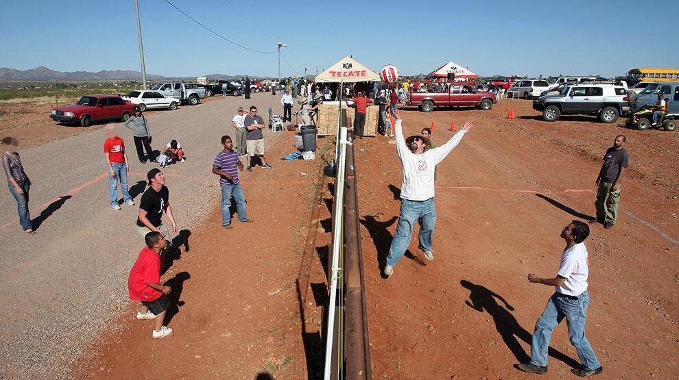 مباراة كرة طائرة بين سكان المكسيك يمين وسكان أمريكا يسار على السياج الحدودي الفاصل بين البلدين