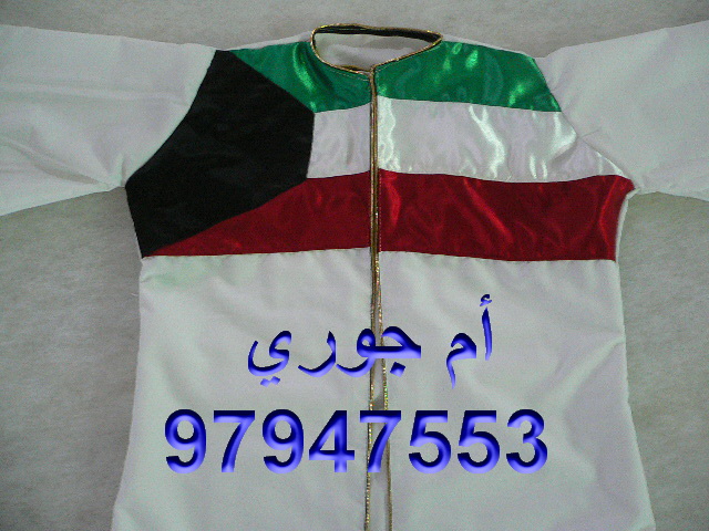 دشداشة مميزة ومزدانة بعلم الكويت من قطعتين مع زري ومعها طاقية العلم